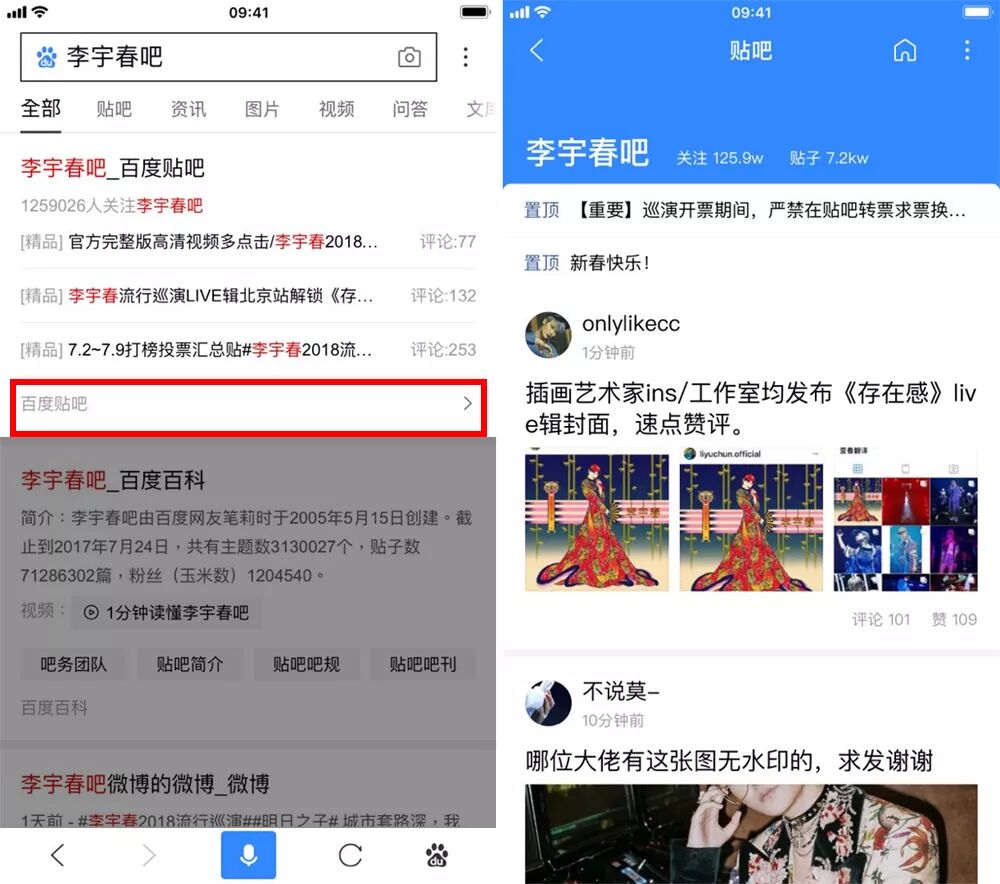 流量方面的优势即开放百度的全域流量都给开发者,包括「搜索 + 信息流」。以「百度贴吧」智能小程序为例,在百度 app 中搜索「李宇春吧」,不仅会出现李宇春贴吧的网页信息,同时也会出现小程序入口,点击引导入口即可进入「百度贴吧」智能小程序中的「李宇春吧」。