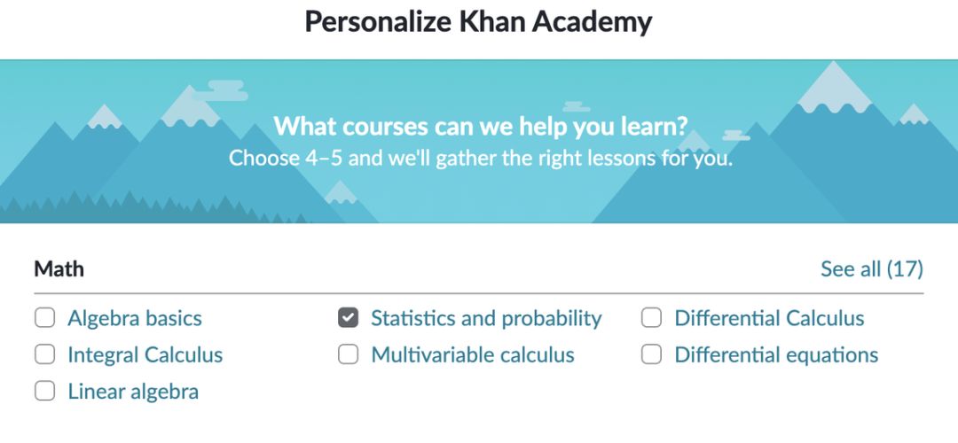 可汗学院几乎涵盖以下列举的所有概念,且可免费学习。你可以在注册可汗学院时选择想要学习的主题,这样就可以得到量身定做的理论学习路径了。查看下图中的所有复选框,提前了解下文将要列举的大部分理论元素。