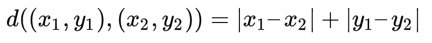 其中 (x1,y1) 和 (x2,y2) 是笛卡尔平面上的坐标点。虽然欧氏距离应用面很广,但在某些情况下也不起作用。假设你在一个大城市散步;如果有一个巨大的建筑阻挡你的路线,这时你说「我与目的地相距 6.5 个单位」是没有意义的。为了解决这个问题,我们可以使用曼哈顿距离。曼哈顿距离公式如下: