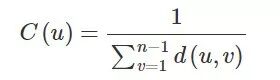 其中 u 是我们要计算紧密性中心性的节点,n 是网络中总的节点数,d(u,v) 代表节点 u 与节点 v 的最短路径距离。更常用的公式是归一化之后的中心性,即计算节点到其他节点的平均距离的倒数,你知道如何修改上面的公式吗?对了,将分子的 1 变成 n-1 即可。