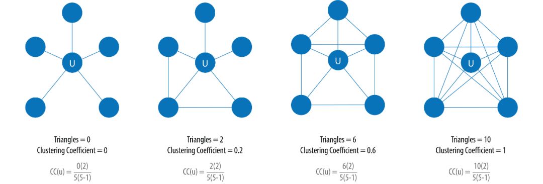 局部聚类系数计算一个节点的邻居之间的紧密程度,计算时需要三角计数。计算公式: