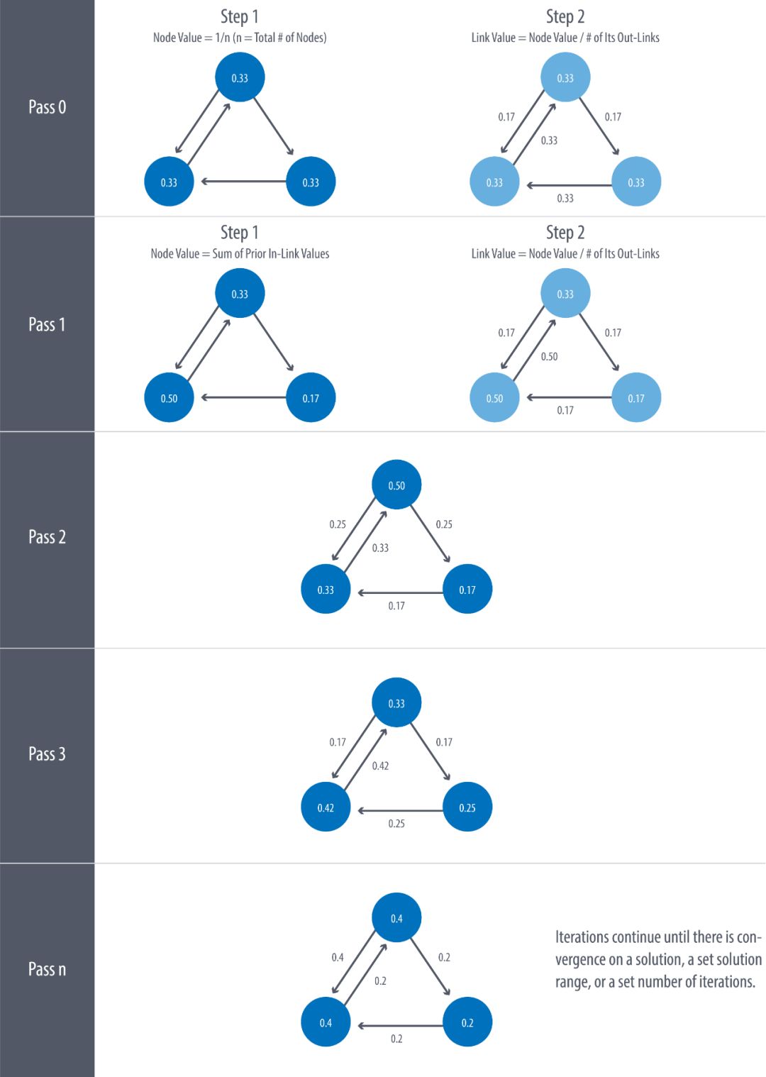PageRank 算法以谷歌联合创始人拉里·佩奇的名字命名,他创建了这个算法来对谷歌搜索结果中的网站进行排名。不同的网页之间相互引用,网页作为节点,引用关系作为边,就可以组成一个网络。被更多网页引用的网页,应该拥有更高的权重;被更高权重引用的网页,也应该拥有更高权重。原始公式: