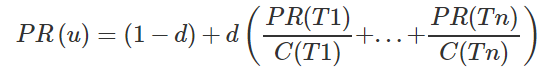 其中,u 是我们想要计算 PageRank 的网页,T1 到 Tn 是引用的网页。d 被称为阻尼系数(damping factor),代表一个用户继续点击网页的概率,一般被设置为 0.85,范围 0~1。C(T) 是节点 T 的出度。