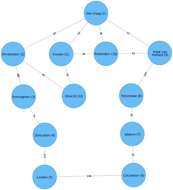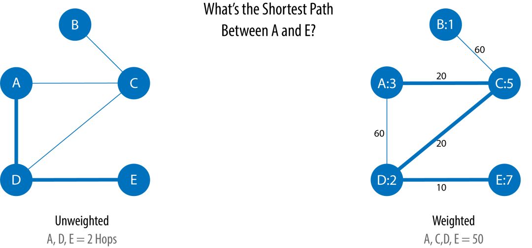 如果没有权重,计算最短路径时,实则在计算关系(Relation,也称 Hop)的数量。那么在上图左边,我们找到 A 和 E 之间的最短距离为 2,经过 D 点。如果像上图右边所示,边被赋予了权重,用以代表节点之间的物理距离(单位:KM)。那么我们可以找到 A 和 E 之间的最短距离是 50 KM,需要经过 C 和 D 两个点。而此时,在未加权图中计算的最短路径 A-D-E 距离为 70 KM,比我们找到的路径 A-C-D-E 距离远。