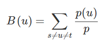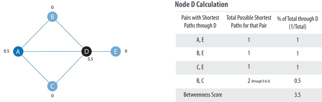 其中,p 是节点 s 与 t 之间最短路径的数量,p(u) 是其中经过节点 u 的数量。下图给出了对于节点 D 的计算过程: