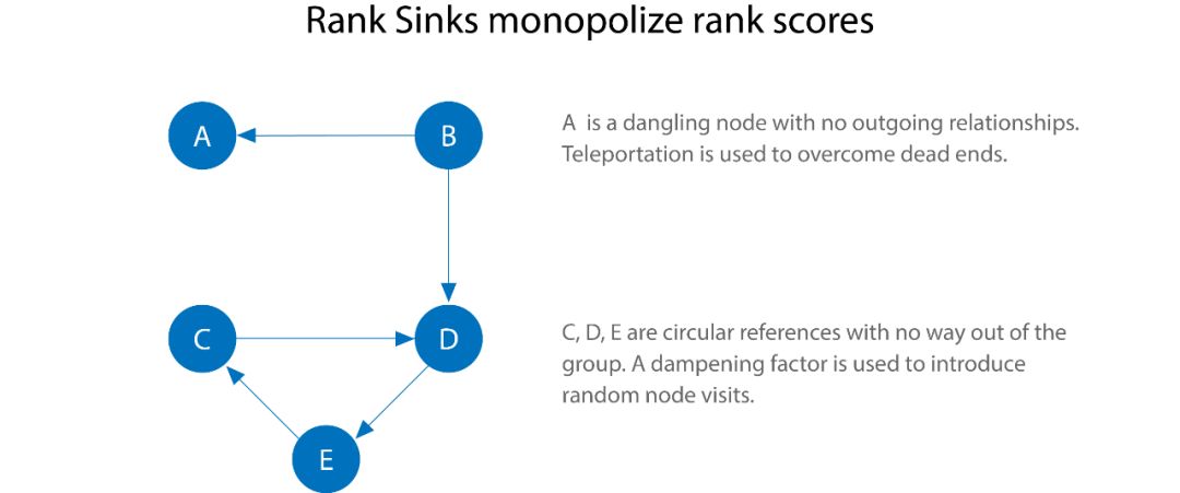 当然,上图的计算并没有考虑阻尼系数,那为什么一定要阻尼系数呢?除了我们定义的链接访问概率,有没有别的意义呢?从上图的过程中,我们可能会发现一个问题,如果一个节点(或者一组节点),只有边进入,却没有边出去,会怎么样呢?按照上图的迭代,节点会不断抢占 PageRank 分数。这个现象被称为 Rank Sink,如下图: