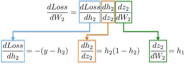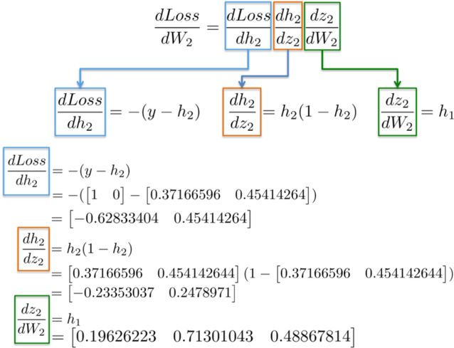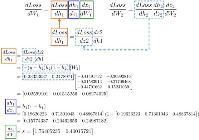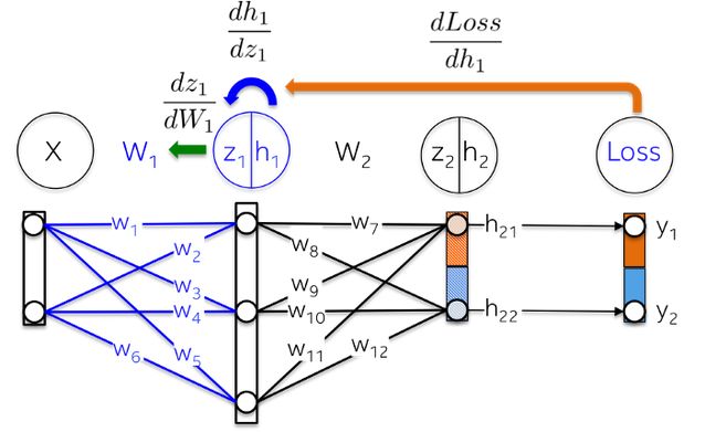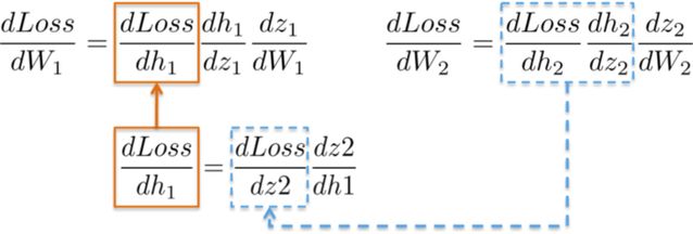 例如,偏导数 dLoss/dh_2 和 dh_2/dz_2 在上一节中已经被计算为输出层 dLoss/dW_2 学习权值的依赖项。
