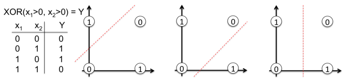 为了描述这个重要的概念,请注意下图中,一条直线是为何不能对异或函数输出中的 0 和 1 进行分类。现实生活中的问题也是非线性可分的。