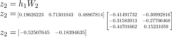 第 2 层 h_2 中发生了类似的过程。让我们首先来计算第一个隐藏层的加权和 z_2,它现在是输入数据。