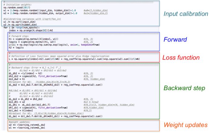 让我们仅使用 numpy 作为线性代数引擎来将上面的数学方程转换成代码。神经网络在一个循环中进行训练,其中每次迭代会给神经网络展示标准的输入数据。在这个小例子中,我们只考虑每次迭代中的整个数据集。前向步骤、损失函数和反向步骤的计算会得到比较好的泛化,因为我们在每一次循环中都用它们对应的梯度(矩阵 dL_dw1 和 dL_dw2)来更新可训练的参数。