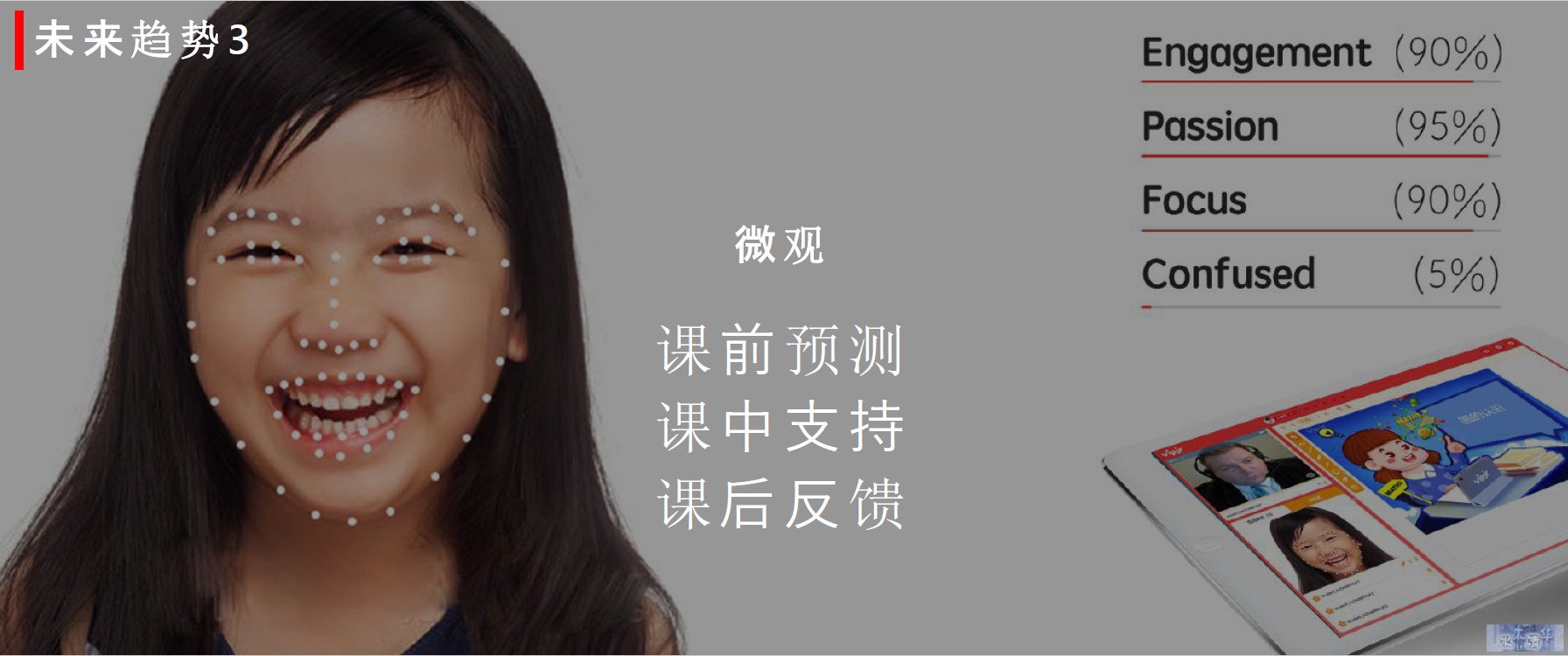 - 好未来、VIPKID等:主要在教学环节应用AI图像识别技术了解学生和老师的情绪、状态;
