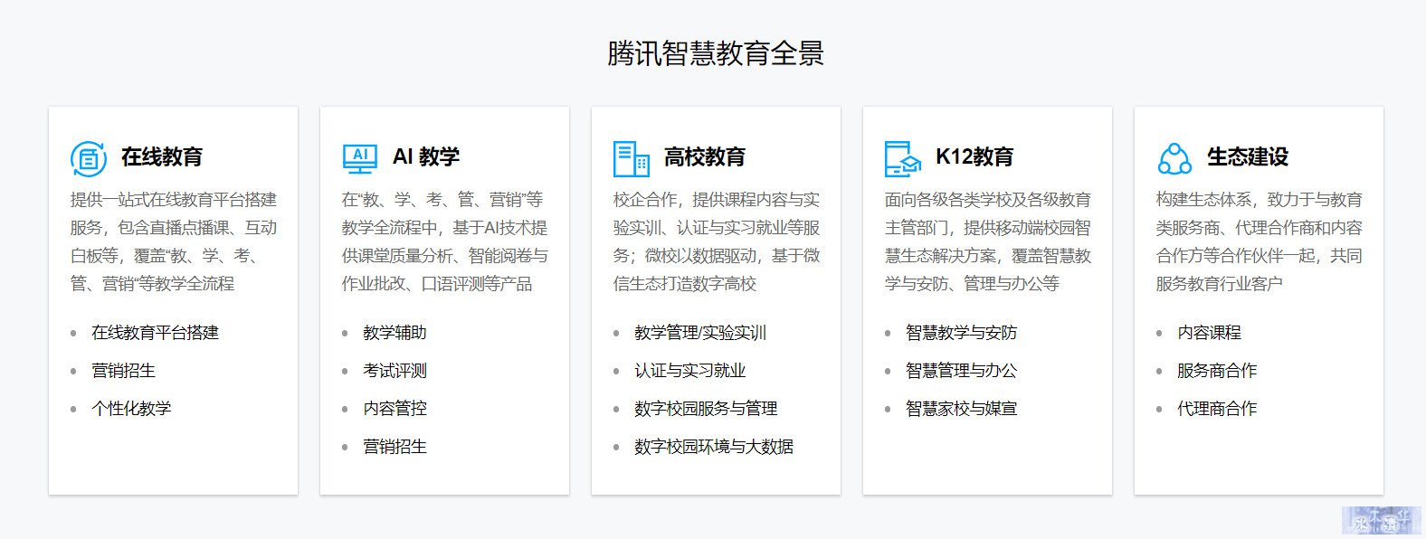 推出“腾讯云+智慧校园”解决方案,结合腾讯多平台资源,为教育局、学校、学生、教师及家长提供智慧教学、智慧家校、智慧宣传、智慧安防、智慧办公、智慧数据等智慧产品,并利用微信校园卡打通校园服务场景,企业微信打造移动化校园管理平台,而腾讯云则助力校园升级大数据能力。