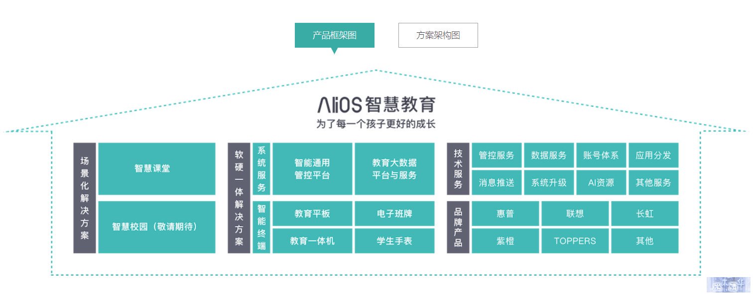推出的AliOS 智慧教育解决方案,包括系统服务产品和智能终端产品,目的是通过通用管理平台、教育账号管理体系及服务、教育应用中心及分发服务、教育大数据平台及个性化服务等产品,实现多端互联、内容融合和数据智能。